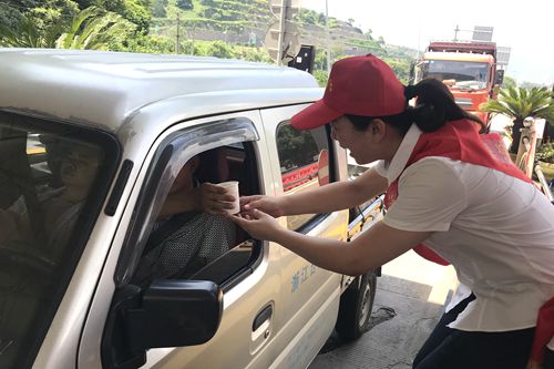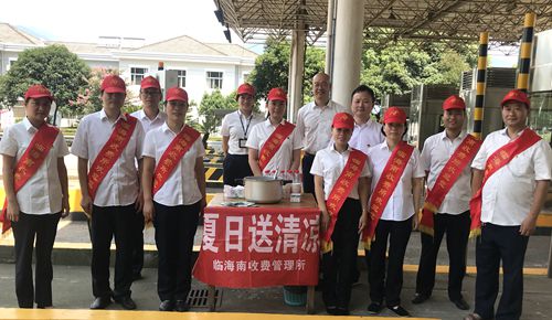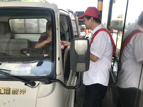 天氣雖炎熱,服務不“打烊”。 在活動中,志愿者們不顧自身大汗淋漓,仍身披橫幅,頭戴小紅帽,面帶微笑向途經收費所的司機們遞上一杯杯綠豆湯、一瓶瓶礦泉水。同時,大家還不忘宣傳行車安全注意事項,提醒司機朋友在高溫酷暑時節多注意行車安全。