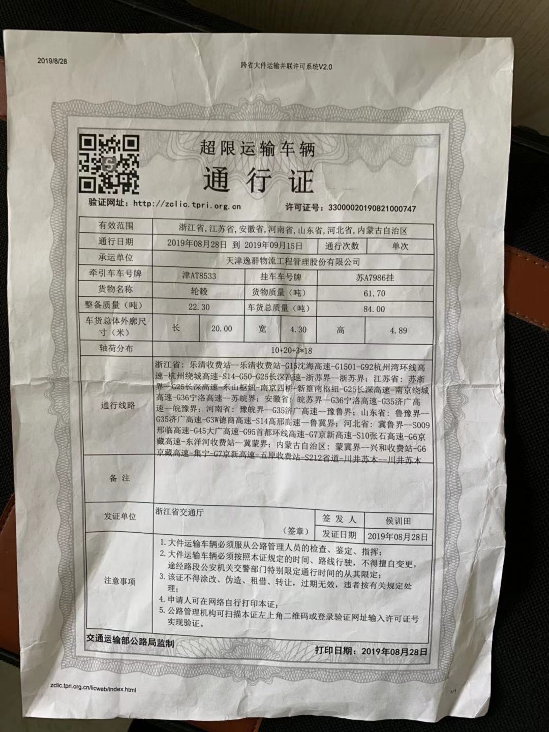經詢問得知,該車辦理了超限運輸車輛通行證,運載大型輪轂從樂清上高速去內蒙,結果行駛至臺州時,車子出了故障。該車車重84噸,原本需要繳納通行費695元,大件運輸優惠后僅需繳納395元。雖然車子壞了,但駕駛員依然向工作人員表示感謝,并感言合法裝載的好處,不然還要面臨處罰。入口封閉大概二十分鐘后,車道恢復通行。