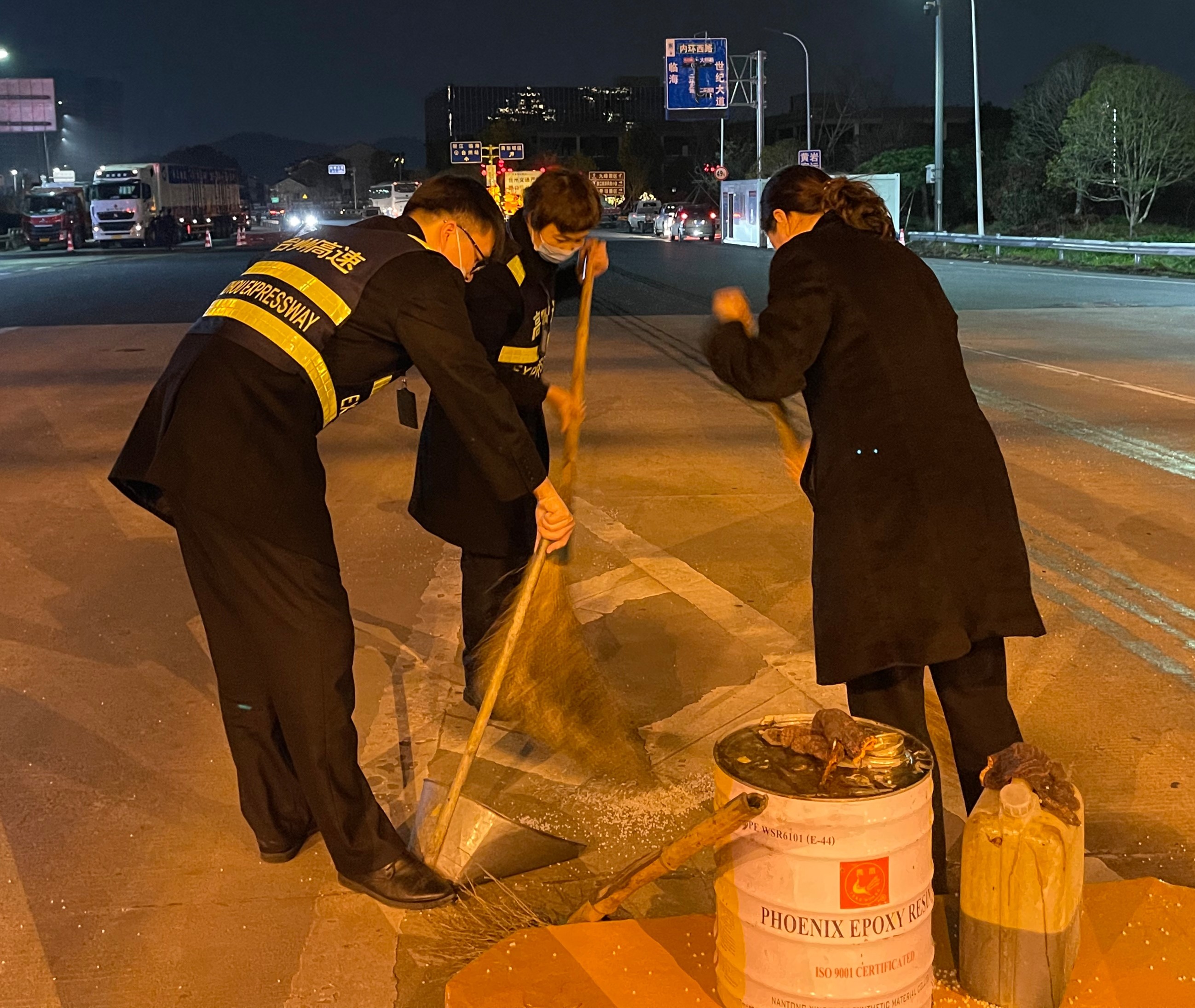 一時之間,車道路面上落滿大量的塑料顆粒,考慮到夜色已深,ETC車道上行駛的車輛速度大多很快,萬一司機沒有及時發(fā)現(xiàn)前方道路上的灑落物,極易造成輪胎打滑,嚴重影響行車安全。情況緊急,為了后續(xù)通行車輛的安全,收費班長立刻關閉了該ETC車道,并放置警示標志,然后將這一情況上報給監(jiān)控中心和收費所值班人員。不等清潔人員到來,收費員羅時杰從車道的工具房拿出掃帚和簸箕,主動開始清掃工作。隨后其他不坐崗的收費員也投入到了清掃工作中,這支臨時清掃小隊在沒有任何人的領導下自發(fā)地組織起來。這時,從高速上完成機電養(yǎng)護工作的機電班工作人員正巧路過,他們看到這一幕立刻將車??吭谝贿叄尤肭鍜哧犖椤?/span>盡管散落的塑料顆粒數(shù)量較多,但在大家的共同努力下,車道終于被清理干凈,恢復了正常通車。