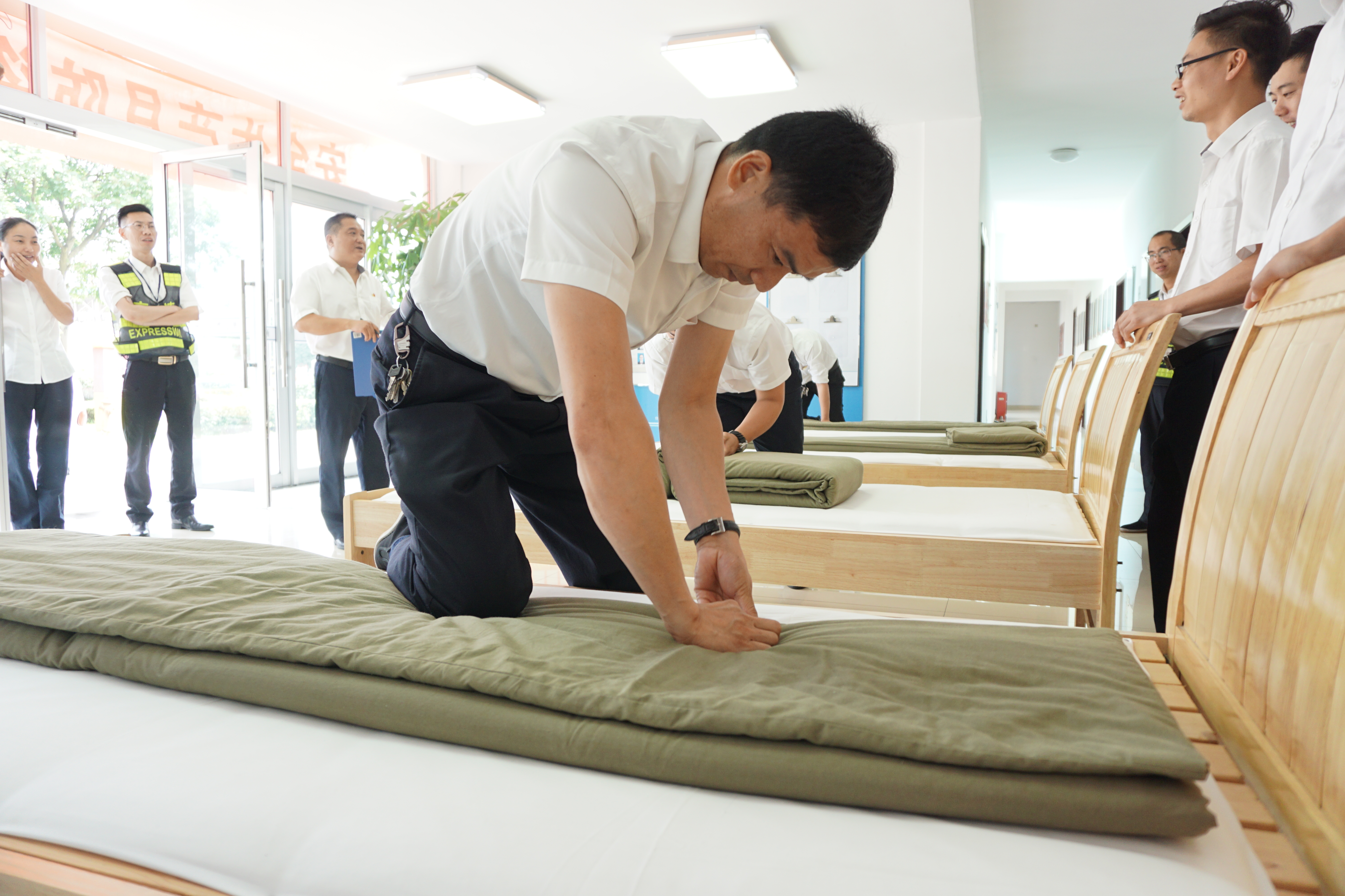 圖為比賽現場 活動現場,裁判宣布比賽規則及打分標準:評分從被子整體形狀、平整度、棱角明顯、折疊時間等方面判斷,規定在5分鐘內完成,共設置一、二、三等獎三個獎項。內務半軍事化在該所已是常態,參賽選手們很快進入狀態,從鋪到疊再到整,駕輕就熟,均能在規定時間內整出“豆腐塊”。評委現場進行點評和打分。經過競逐,最后副站收費四班何翊平奪得一等獎。比賽分四輪進行,且全程用時不到1個小時。