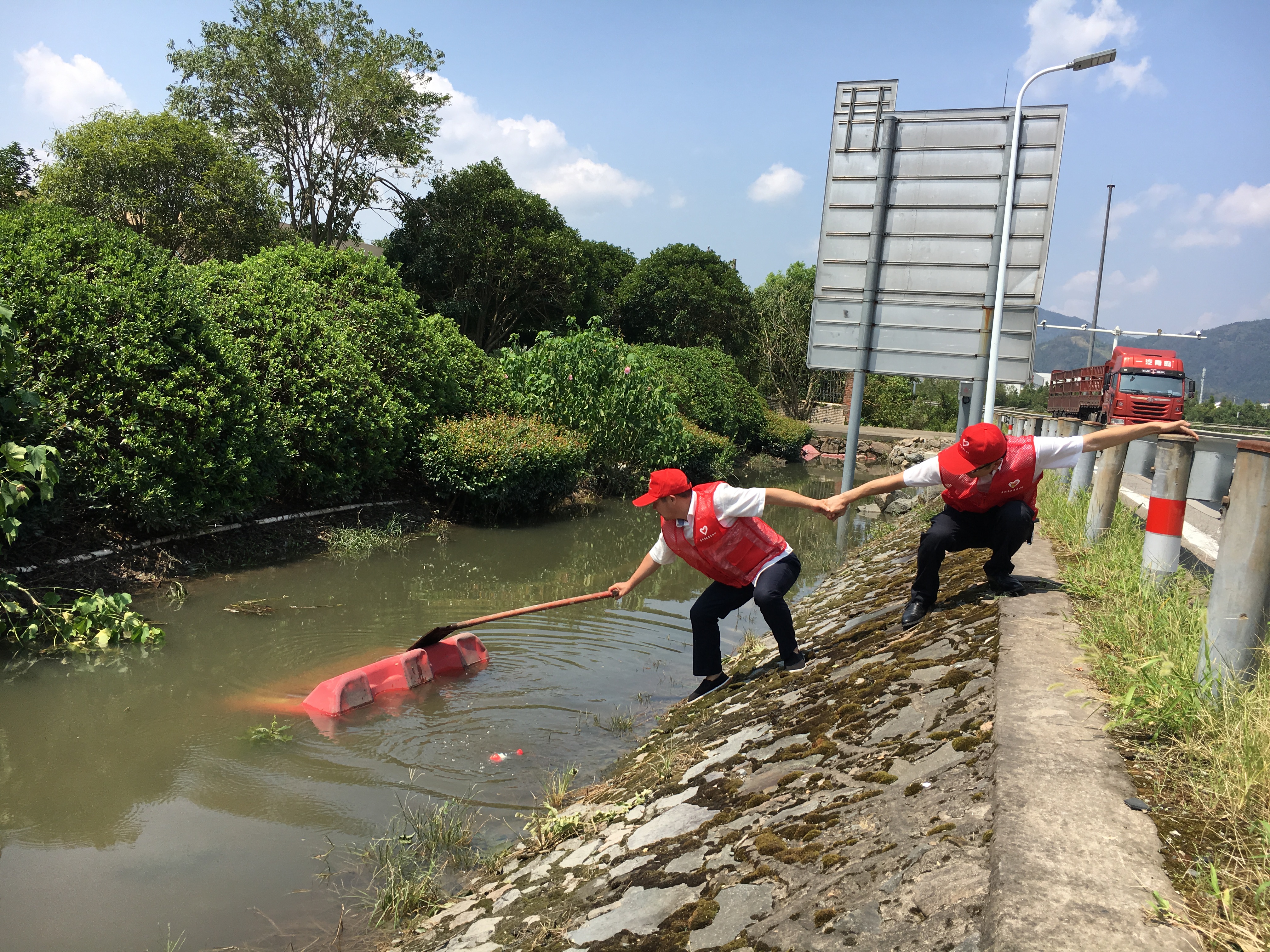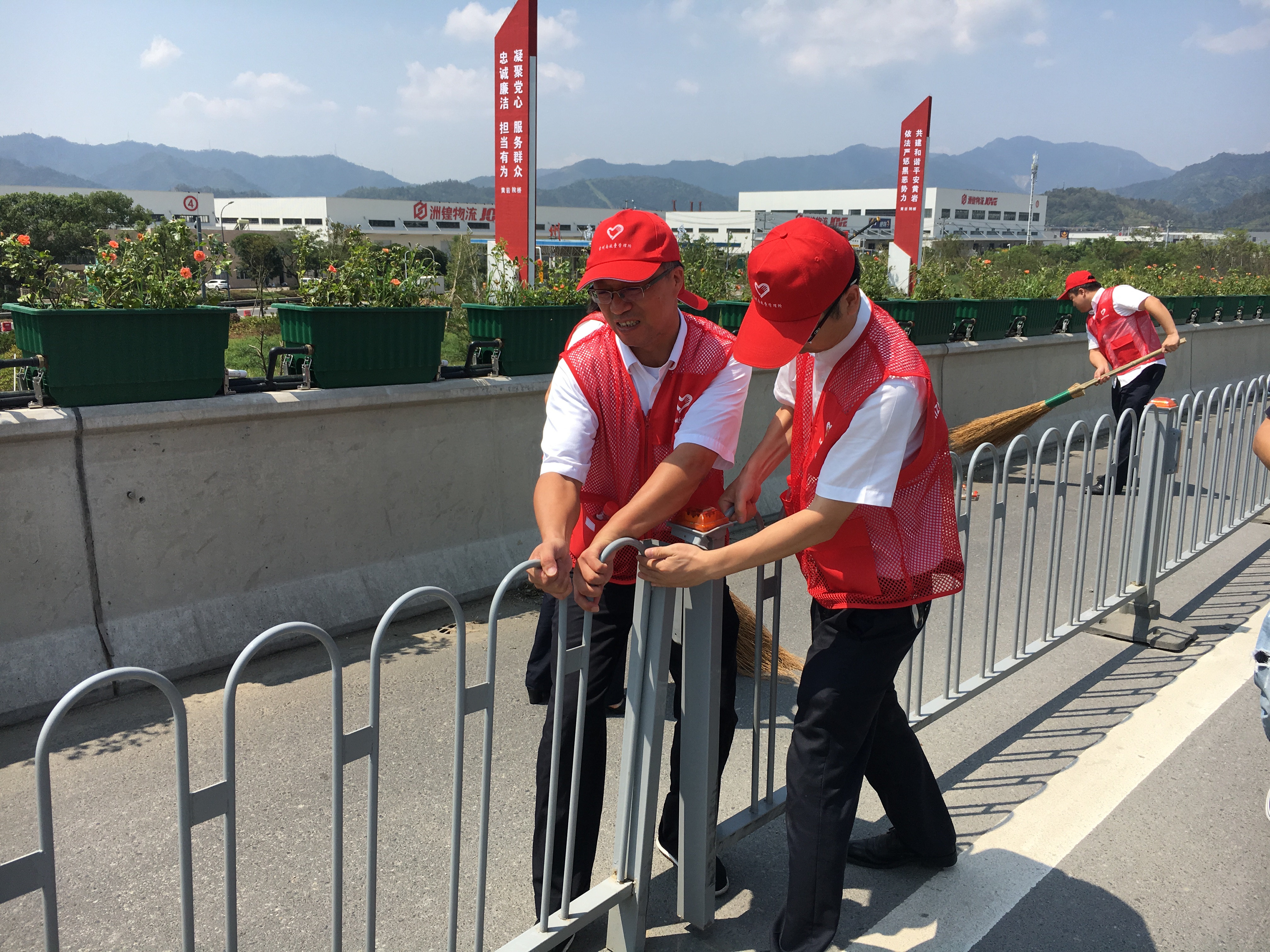 圖為志愿服務現場 隔離護欄被風吹歪的,將其扶正,并作簡單的固定;綠化帶好多樹被連根拔起,找來撐桿、繩子進行加固;斷枝殘葉滿地都是,就用手撿,用掃把掃,集中堆放倒伏的斷枝;清掃路上的垃圾;清除路障;打撈被風吹入邊溝的水馬;對收費區域的衛生來了一次大清理…… 臺風后氣溫升高,空氣濕度大,天氣異常悶熱,志愿者們揮汗如雨,一個個臉被曬得通紅,他們卻沒有因此放下手中的工具,停滯清理的步伐,迎“熱”而上,為災后的恢復貢獻自己的力量,用行動踐行初心和使命。 夏蓮萍