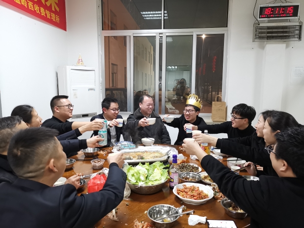 1月30日傍晚,溫嶺西費所二班成員齊聚 在單位食堂,為小壽星洪燈杰舉辦了一場簡單而又有意義的生日宴會