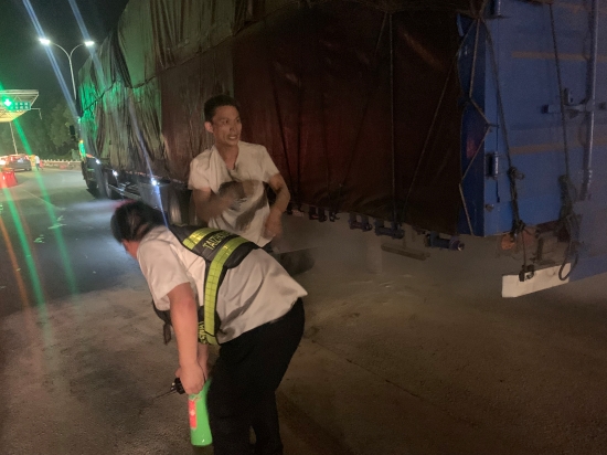 當時,正值收費員林王鍵負責高速入口安全工作。他在巡查自助發(fā)卡機發(fā)現(xiàn)入口處一輛貨車突然起火,隨之冒起了大片煙霧,并伴隨著刺鼻的氣味。林王鍵見狀立馬拎起身邊的滅火器就向貨車跑去,并且向班長報告。在工作人員和司機齊心協(xié)力撲救下,大火十幾分鐘就被撲滅了。經(jīng)過檢查,起火的原因是因為貨車剎車突然抱死,摩擦起火。所幸大火并未造人人員傷亡和財產(chǎn)損失。