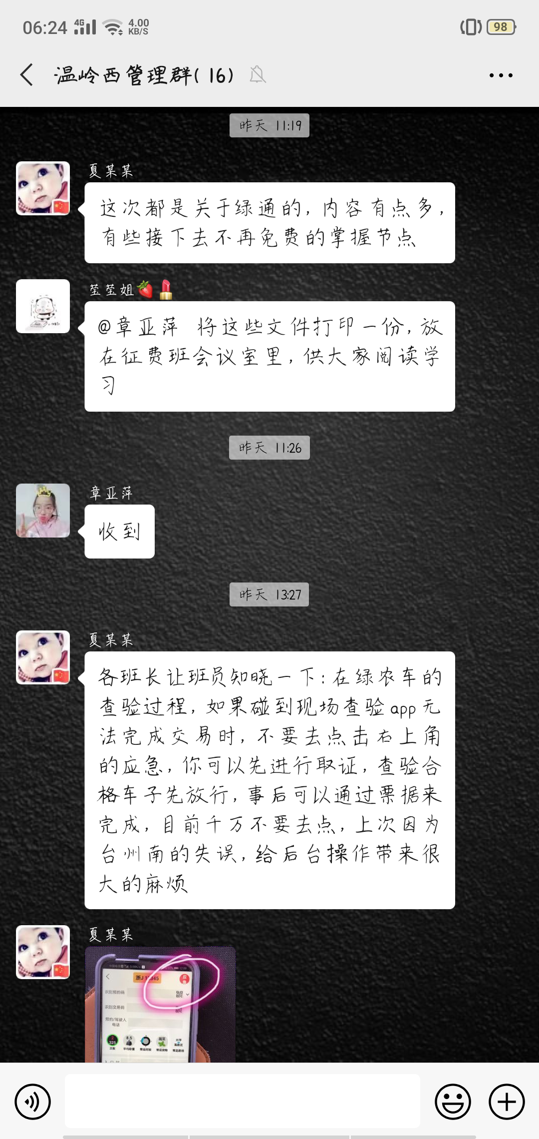培訓(xùn)采取集中學(xué)習(xí)與線上學(xué)習(xí)相結(jié)合,理論知識與現(xiàn)場操作相結(jié)合、互動交流與相互提問相結(jié)合的方式開展,通過釘釘、微信等學(xué)習(xí)平臺,天,各班班長組織班員開展崗前五分鐘提醒班組集中學(xué),確保每一名收費(fèi)人員能夠熟練掌握新收費(fèi)系統(tǒng)的各項(xiàng)操作流程。此外,各班班長及時(shí)梳理匯總收費(fèi)員們在實(shí)際操作中遇到的問題,并上傳至管理群群中全員參與,一起討論學(xué)習(xí)。遇到無法解決的問題時(shí),所負(fù)責(zé)人第一時(shí)間與上級主管部門溝通,尋求最佳解決方案,并發(fā)布到群里,明確操作流程和統(tǒng)一相關(guān)政策解釋工作。