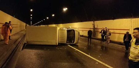 事后經了解,因當天小雨,路面濕滑,該小貨車在剛進隧道不久,司機發現跟車太近,急踩腳剎車,致使小貨車不受控制地翻車,并導致油箱漏油。所幸該事故并未造成人員傷亡和較大損失。