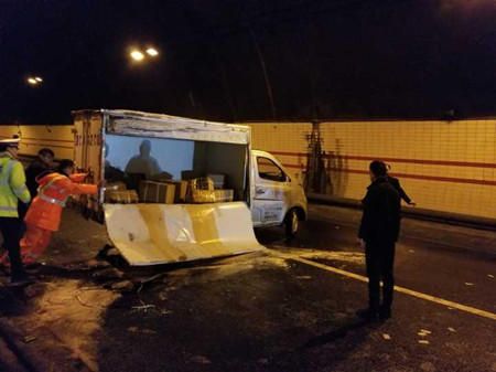 11月30日晚9:46分,中控員陳旦平當班時發現寧波方向隧道進洞600米處,一輛小貨車側翻橫臥在兩個車道上,導致后方車輛無法前行。他隨即啟動隧道事故處置預案并通知執勤隊員前去查看。