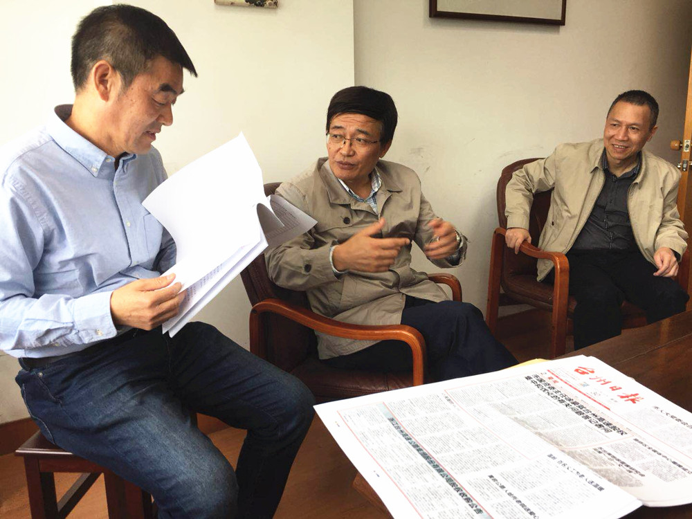 圖為市國資委主任徐豪和集團(tuán)總經(jīng)理張建平一起走訪市財(cái)政局股東單位