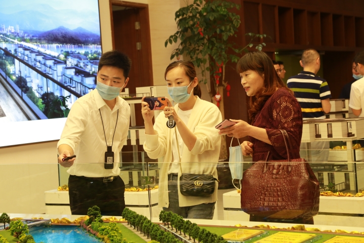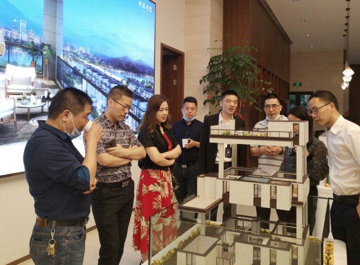 圖為陳文波對(duì)照?qǐng)D紙了解樓盤(pán)情況 在銷(xiāo)售展廳樓盤(pán)沙盤(pán)前,陳文波聽(tīng)取了高速房產(chǎn)(集團(tuán))公司負(fù)責(zé)人關(guān)于玖璽逸墅項(xiàng)目銷(xiāo)售計(jì)劃、認(rèn)籌客戶等情況匯報(bào)。他對(duì)前期房產(chǎn)公司的辛苦付出給予充分肯定,要求大家認(rèn)真服務(wù)好每一個(gè)來(lái)訪客戶,彰顯出國(guó)企品質(zhì),全力做好銷(xiāo)售工作。 當(dāng)天,銷(xiāo)售展廳樓內(nèi),陸陸續(xù)續(xù)有客戶進(jìn)出,“我很早就看中這個(gè)樓盤(pán)了,不僅位置好,而且采光好、通風(fēng)好,居住在這里一定非常舒服。”一名準(zhǔn)客戶張女士夸贊道,今天她特意前來(lái)交付認(rèn)籌金。  圖為客戶在疊墅沙盤(pán)前參觀