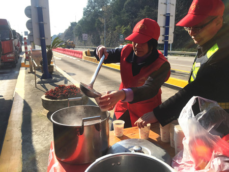圖為工作人員給過(guò)往司機(jī)送姜茶