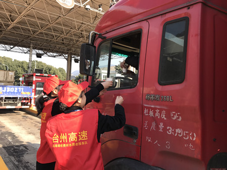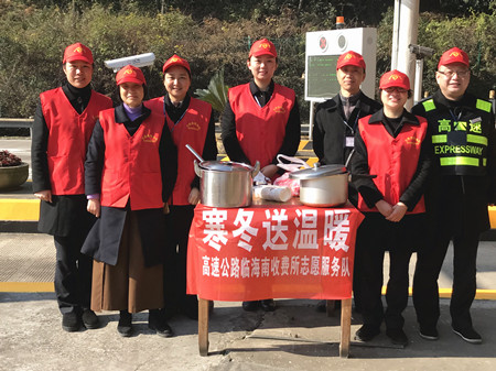 1月12日上午,臨海南收費(fèi)所的收費(fèi)員們走出崗?fù)ぃ_(kāi)展了一場(chǎng)“寒冬送溫暖”活動(dòng)。