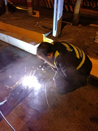 到了現場,隊員發現該車道輪檢器鐵板螺孔由于不斷摩擦并逐漸變大,導致整顆螺栓脫離底下固定螺座,加之當天是春節高速免費第一天,車輛經過時車速都較快,直接將整塊鐵板帶離底座。如果不及時對鐵板進行加工恢復,不僅不能保護下面的輪檢器,而且還有可能造成車輛爆胎??沙σ谷考庸S都已關門,如果讓廠家發貨至少也要好幾天。正在兩難之際,中心副經理葉俊想到將鐵板與底座邊緣直接焊死的臨時應急方法,待節后再向廠家定制或重新購買。 方案有了,大家兵分兩組,一組去中心倉庫拿電焊機、電焊條等設備,一組待在原地清理鐵底下方於泥等雜物,為隨后的電焊工作做準備。設備到位后,葉俊一手操起電焊罩,一手熟練的將電焊條點在了鐵板與底座邊緣之間,經過近一個小時的處理,輪檢鐵板與地面底座牢牢地固定在一起,再也不用被飛馳而過的車輛帶離。 項寅曉