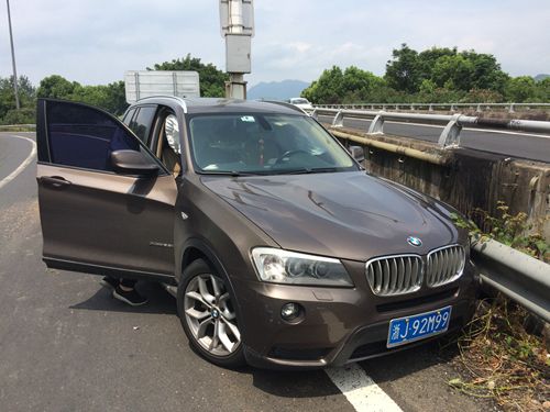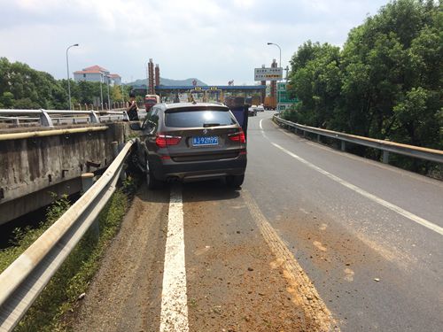 8月13日上午10:30分左右,臺州收費所出口寧向匝道口有一輛黑色寶馬X3斜靠在護欄旁,其車頭左側因碰撞護欄而嚴重凹陷,左前輪胎報廢,所幸沒有人員傷亡。 當時,該所出口五號車道的欄桿發生故障,需要暫時關閉進行維修。班長張海勇在內廣場引導車輛時發現此起事故,走近細看,由于碰撞激烈該車前檔玻璃破裂,前排安全氣囊彈出,而車旁的兩個人驚恐未定不知所措。此時匝道口車流不斷,因駕駛員遲遲找不到三角牌,為避免二次事故的發生,張海勇在車后方指揮交通,并提醒車旁人員站在護欄外安全位置,同時報告指揮中心事故車的位置和損傷情況。