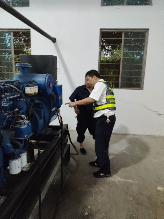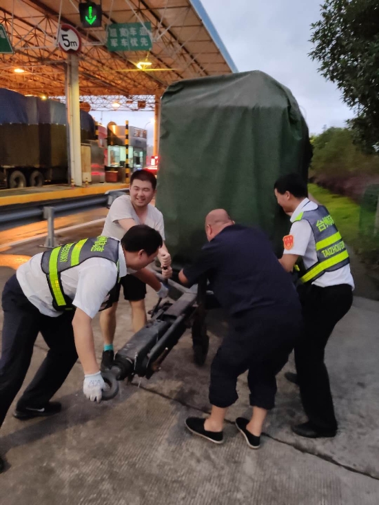 因故障涉及外網(wǎng)高壓供配電,維養(yǎng)中心緊急啟動應(yīng)急預(yù)案,一邊聯(lián)系黃巖供電部門將10KV高壓進(jìn)線斷開,以確保搶修人員人身安全,一邊求助施救中心將停在臺州所的移動發(fā)電機拉至臺州南收費所。但由于該站站房轉(zhuǎn)角偏小,拖車無法進(jìn)入,大家便一起合力將重達(dá)十幾噸發(fā)電機手推至配電房外側(cè),以備不時之需。