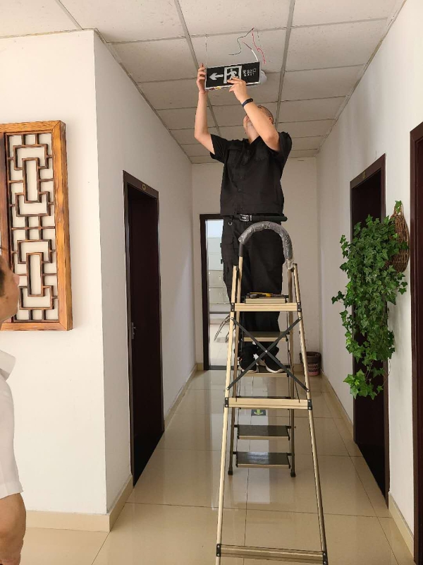 圖為技術(shù)人員安裝現(xiàn)場 在得知這一情況后,維養(yǎng)中心積極協(xié)助收費(fèi)站所購買相關(guān)的主材及配件,并主動(dòng)承擔(dān)了這些設(shè)備安裝工作。由于設(shè)備安裝位置很多沒有直接可用電源,中心技術(shù)員們就從四五米外甚至更遠(yuǎn)的地方,一路套管放線過來取電,并用電錘等工具為其開孔固定,最后再完成接線送電。經(jīng)過2天努力,這些帶有方向提示標(biāo)識(shí)、安全出口標(biāo)識(shí)的燈牌被安裝在各層樓梯出口、拐角或主要通道上,因全部帶有儲(chǔ)電功能,即便在斷電的情況下也能發(fā)光發(fā)亮。
