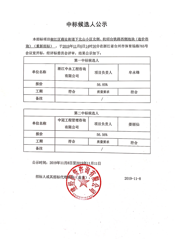 椒江區(qū)葭沚街道下北山小區(qū)北側(cè)、杭紹臺(tái)鐵路西側(cè)地塊(造價(jià)咨詢)中標(biāo)候選人公示