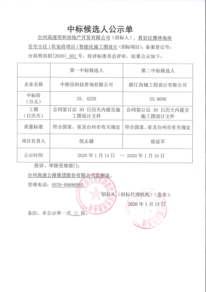 黃巖區雅林地塊住宅小區(玖璽府項目)智能化施工圖設計中標候選人公示單
