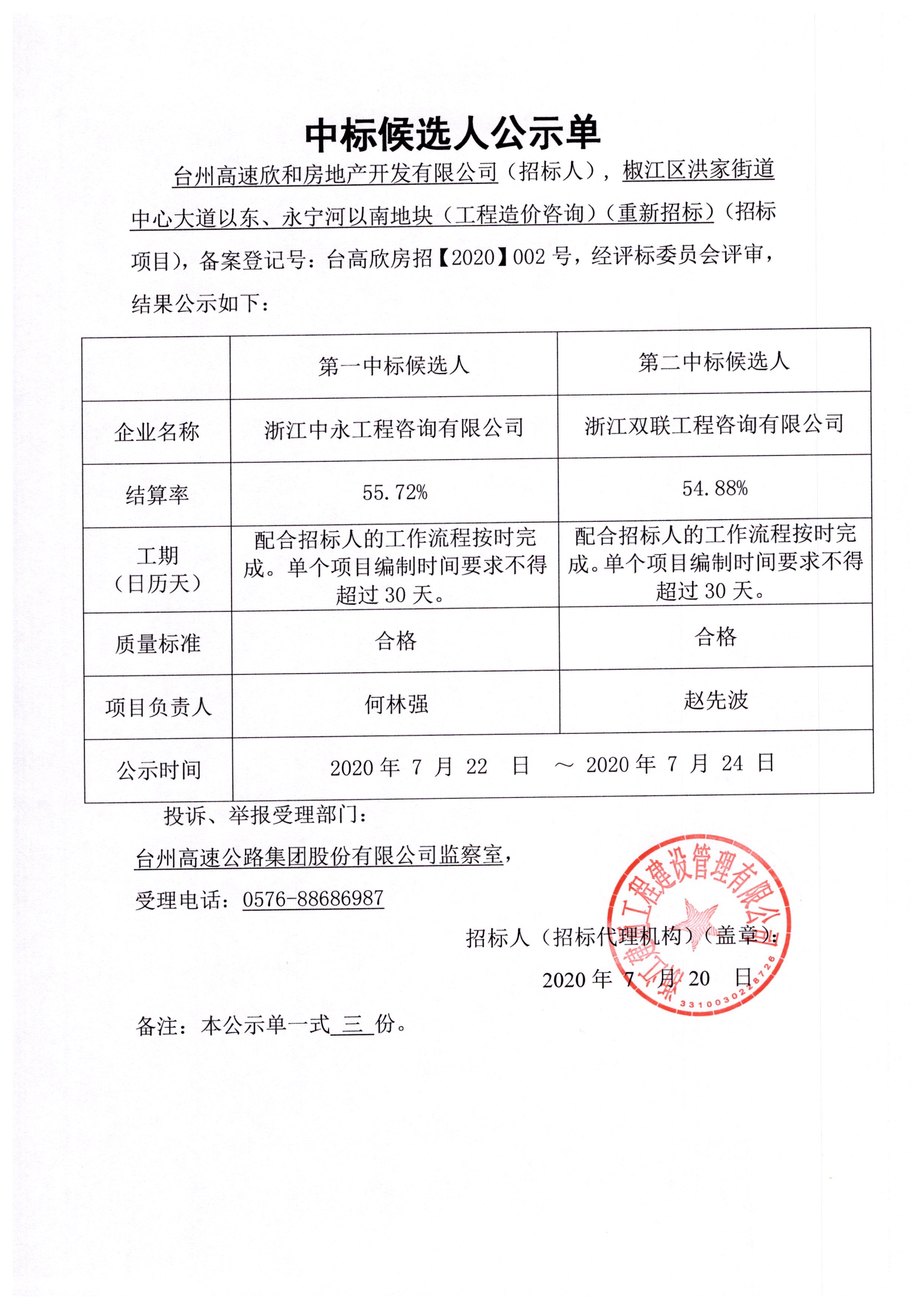 椒江區(qū)洪家街道中心大道以東、永寧河以南地塊(工程造價咨詢)中標候選人公示單