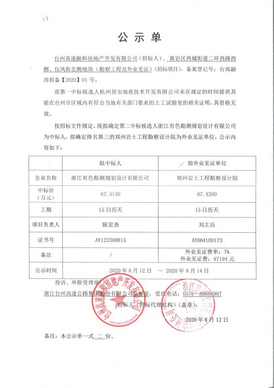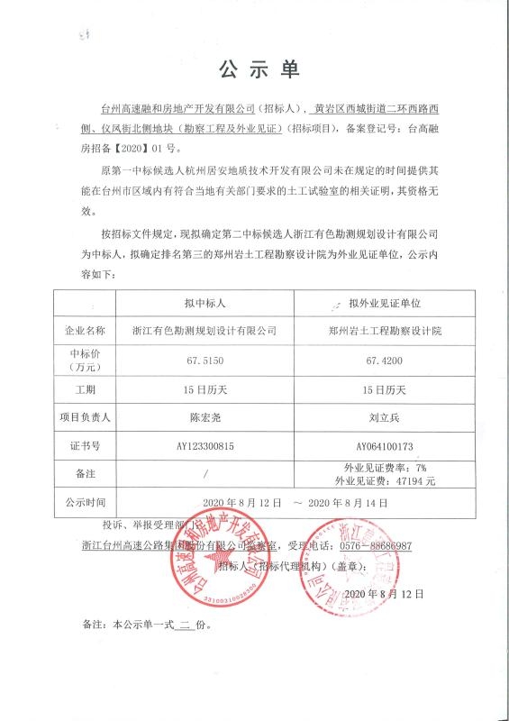 黃巖二環(huán)西路西側(cè)、儀風街北側(cè)地塊(勘察工程及外業(yè)見證)中標公示
