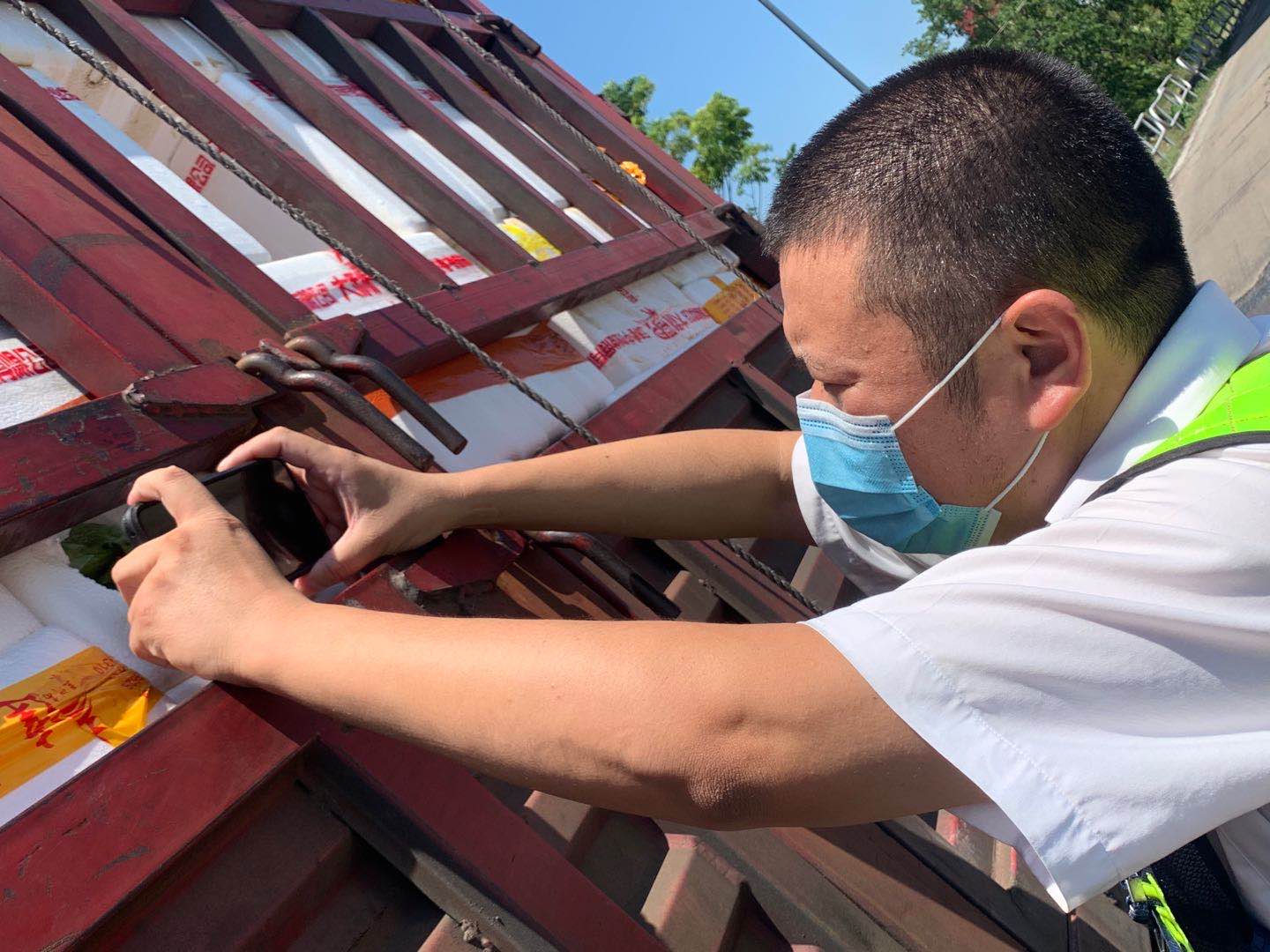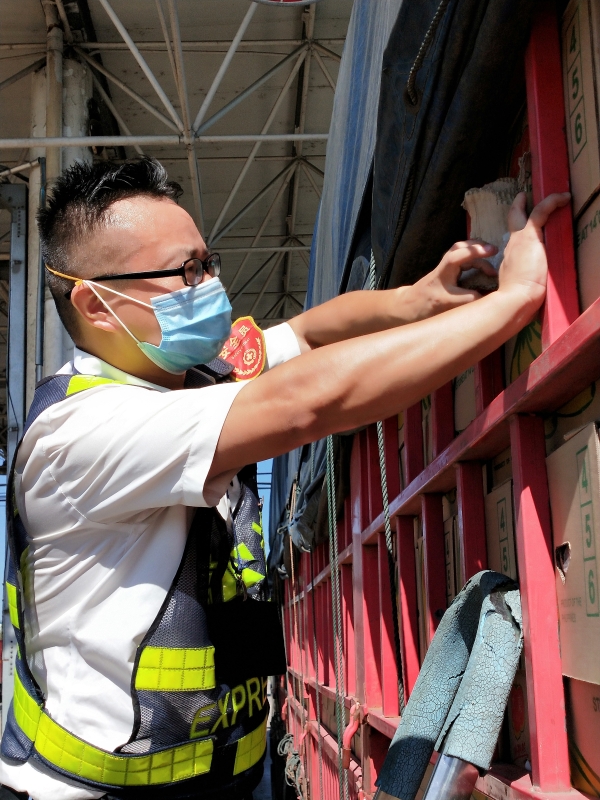 檢查綠農(nóng)車,遇到攀爬驗貨時,車輛欄桿因高溫炙烤至少在四五十度以上,臺州南收費所班長周冬子笑著說:現(xiàn)在的車欄桿都辣手了,腳底板也像踩了風(fēng)火輪話音還未落,只見他蹭蹭幾下,已然爬上貨車,一邊檢查貨物一邊用袖子蹭掉臉上豆大的汗珠,被曬得黝黑發(fā)紅的皮膚在烈日下格外醒目。綠農(nóng)車開走后,他顧不上滿身汗水,拿起了掃把開始打掃灑落在車道上綠農(nóng)產(chǎn)品。因為他知道,這些灑落的農(nóng)產(chǎn)品,如不及時清理,在太陽曝曬后將會更加刺鼻,影響收費站的形象。