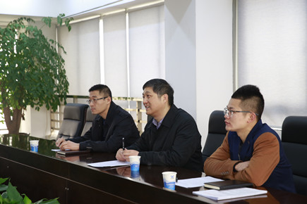 圖為市國(guó)資委副主任金偉一行在聽(tīng)取匯報(bào)