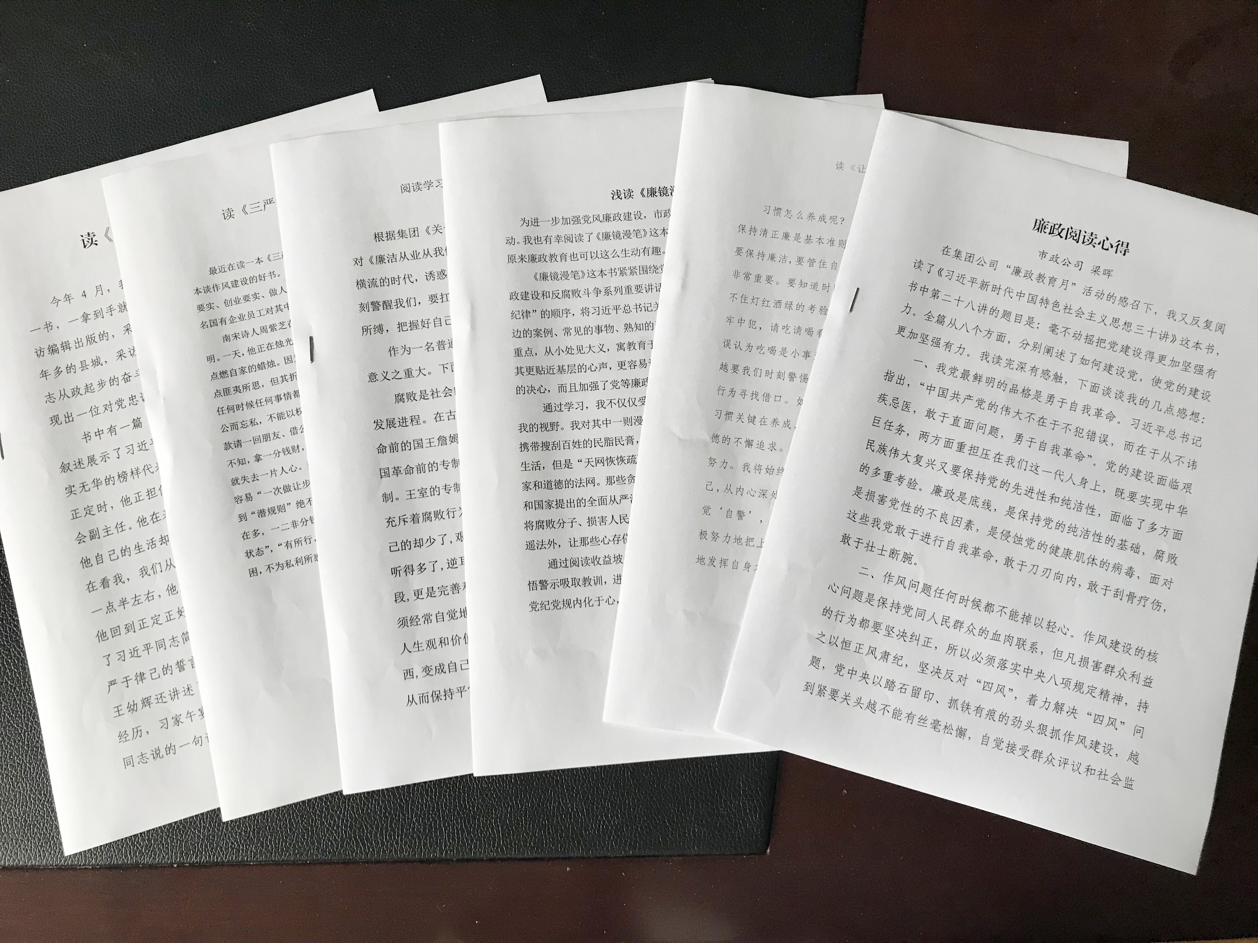 5月月初,市政公司組織開展讀書思廉活動,要求每位員工讀一本勤政廉政書籍,并撰寫一篇讀書心得。從一篇篇心得體會文章中,看到有從歷史廉政小故事切入的,也有從習近平總書記的新時代中國特色社會主義思想和十九大報告中領悟道理的,字字流露了真情實感,句句體現出真切感悟,真正做到了學有所悟,營造了良好的學廉思廉的氛圍。